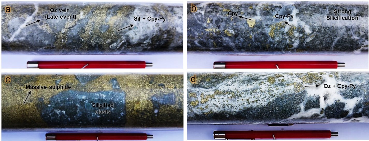All the first five holes have visually confirmed high-grade mineralization at the core of the Romero deposit, showing multiple mineralization events, including massive sulphides, silicification, brecciation and other favorable alteration styles. Figure 2 shows different examples at different depths and locations of the orebody. In addition, assay results for these holes will be obtained as part of the metallurgical test work program currently underway.