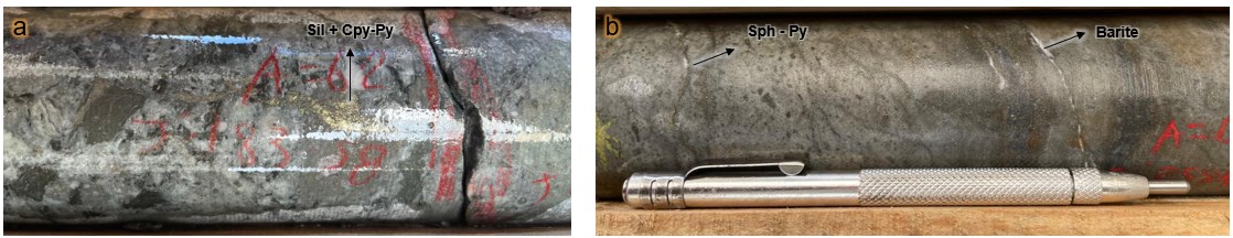 Core samples from TIR-26-57 contain sections with disseminated pyrite, chalcopyrite, barite, and sphalerite in veinlets (Figure 3), similar to mineralization encountered in previous holes at this target. Cutting and sampling are currently in progress, with assay results anticipated by early March.